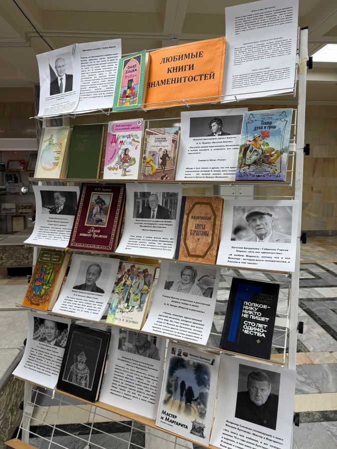 В холле Бажовки вы всегда увидите интересные книжные выставки и подборки. Вот, например, одна из них: «Любимые книги знаменитостей». Здесь: «Рубайи» Омара Хайяма, «Война и мир» Льва Толстого, «Прощай, оружие!» Хемингуэя, «12 месяцев» Маршака – книги, которые любит перечитывать Владимир Путин; «Евгений Онегин» Пушкина, «Театр» Сомерсета Моэма – любимые книги Николая Цискаридзе; роман «Герой нашего времени» Лермонтова любил Андрей Дементьев, «Дерсу Узала» любил Михаил Задорнов, у Галины Волчек в любимчиках Чехов, Владимир Соловьев и Владимир Познер любят роман Булгакова «Мастер и Маргарита», у Евгения Миронова любимая книга – «Борис Годунов» (А.Пушкина).