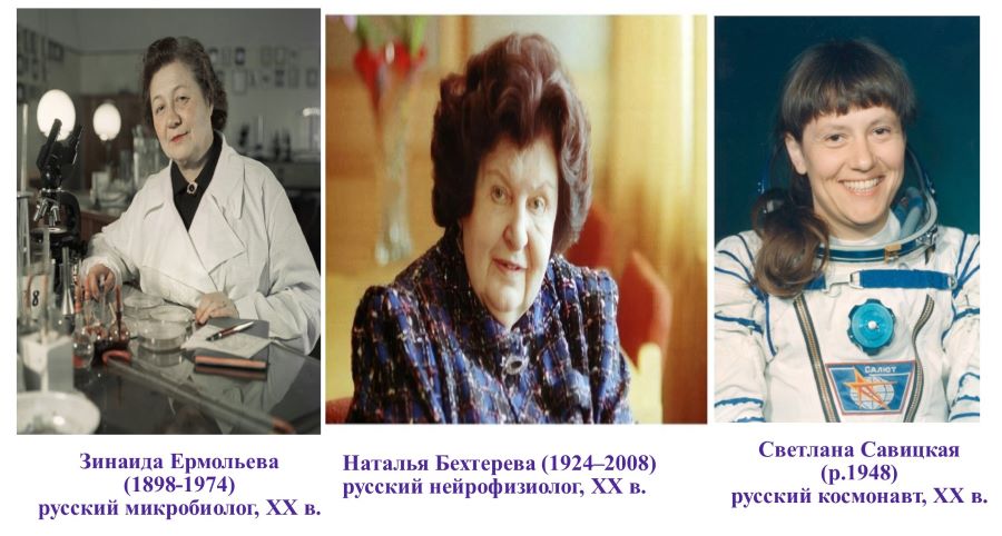 XX век открыл для мира новые имена женщин-учёных. В Советском Союзе первым микробиологом и эпидемиологом стала Зинаида Ермольева, которая в 1915 году выбрала профессию врача, узнав о том, что её любимый композитор Пётр Чайковский умер от холеры. В 1939 году разработала собственный штамм пенициллина – препарат «Крустозин», высокая эффективность которого помогла в борьбе с холерной эпидемией, дифтерией и брюшным тифом. А во время Второй Мировой войны З. Ермольева смогла предотвратить распространение эпидемии холеры под Сталинградом. Благодаря её исследованиям в медицине стало применяться вещество лизоцим. Писатель В. Каверин написал роман «Открытая книга», где прототипом вирусолога стала З. Ермольева..