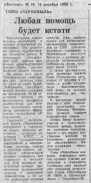 Первое упоминание о деятельности организации удалось найти в газете «Вестник» от 12 декабря 1990 года. Общественная организация Союз «Чернобыль» обратилась к горожанам с просьбой оказать помощь для участников ликвидации последствий аварии на ЧАЭС и поучаствовать в благотворительном вечере для сбора средств на нужды «чернобыльцев». Вечер прошёл 15 декабря в клубе «Строитель». На тот момент в городе проживало более 200 ликвидаторов последствий аварии на Чернобыльской АЭС.