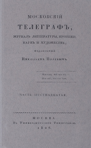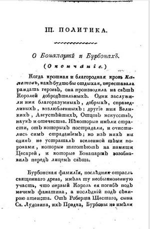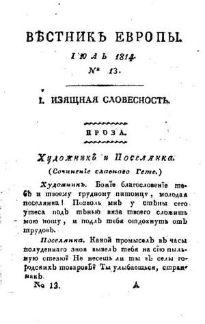 В начале XIX века, при Александре I и Николае I, русские литературные журналы вошли в моду, стали прибыльными и объемными. Например, в знаменитом «Вестнике Европы» под одной обложкой печатались произведения Пушкина, переводы из Гёте, политические новости из Европы, этнографические очерки о зырянах и даже модные тенденции из Парижа.  (1814, № 13).