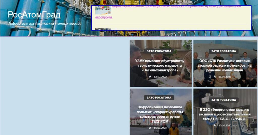 Информационный проект «Росатомград» реализуется при поддержке Департамента по взаимодействию с регионами Госкорпорации «Росатом» и Союза организаций атомной отрасли «Атомные города». Здесь собираются новости и аналитическая информация из атомградов России, касающиеся развития местной экономики, инфраструктуры, ярких социальных проектов. Здесь можно найти информацию о работе малого и среднего предпринимательства, поддержке бизнеса, улучшении инвестиционного климата. Уделяется внимание и новостям градообразующих предприятий, как основе городской экономики.