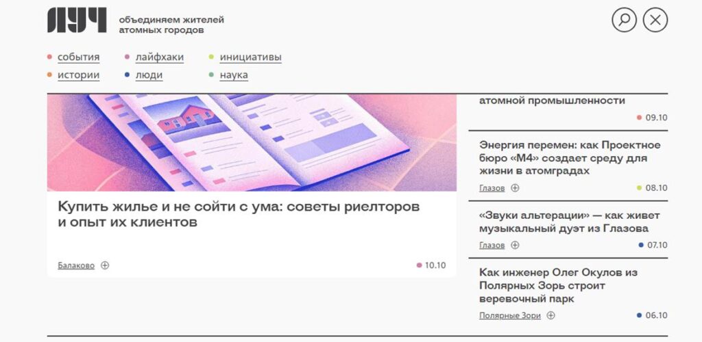 «Луч» — это медиа для жителей атомных городов. Здесь говорят об идентичности атомных городов, а также возможностях для жителей, инициативах и героях. Модераторы сайта считают необходимым проверять информацию и не любят «чернухи».