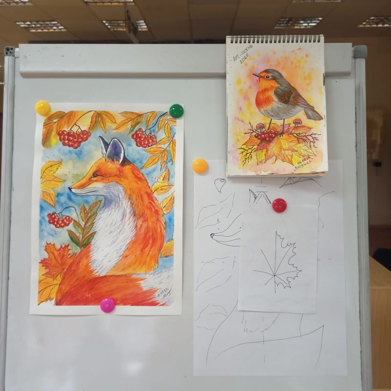 … Пошагово наносятся на бумагу штрихи, и вот оживает уже целый лисий лес из портретов плутовки. Следующее занятие участники договорились посвятить натюрморту и тоже в осеннем живом пространстве: тыквы – подарки осени. Осени, которая пока еще не укрылась снежным покрывалом зимы.