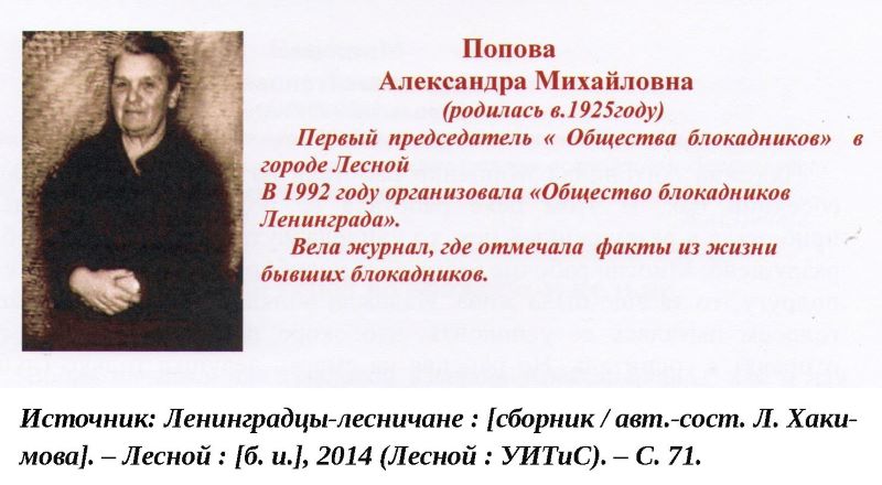 В 1991 году жительница Свердловска-45 (с 1994 года – Лесной) Александра Михайловна Попова, в годы Великой Отечественной войны пережившая блокаду, получила удостоверение «Жителю блокадного Ленинграда».