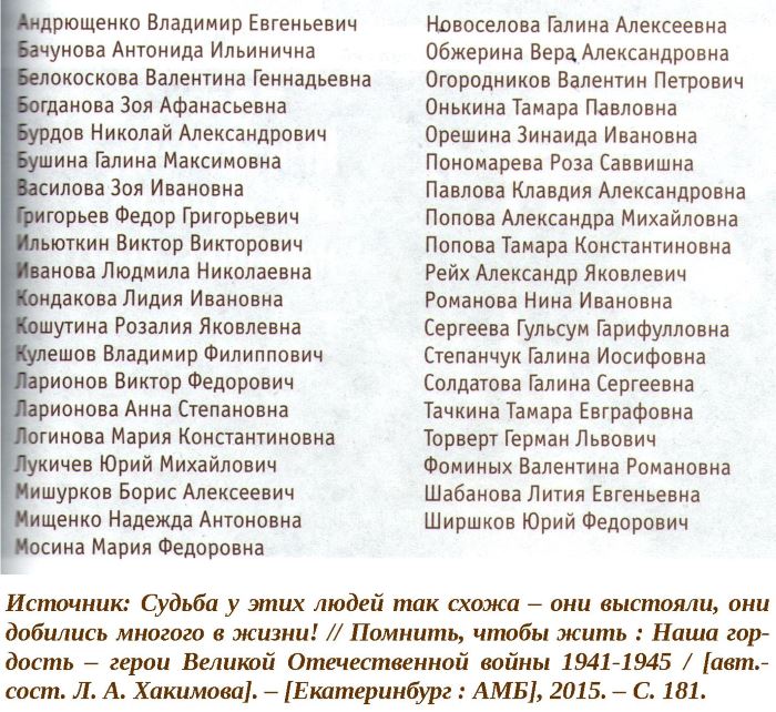- Помнить, чтобы жить : Наша гордость – герои Великой Отечественной войны 1941-1945 / [авт.-сост. Л. А. Хакимова]. – [Екатеринбург : АМБ], 2015. – 272 с. : ил., портр.