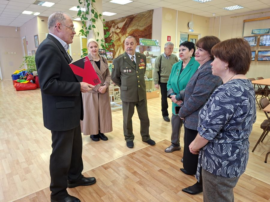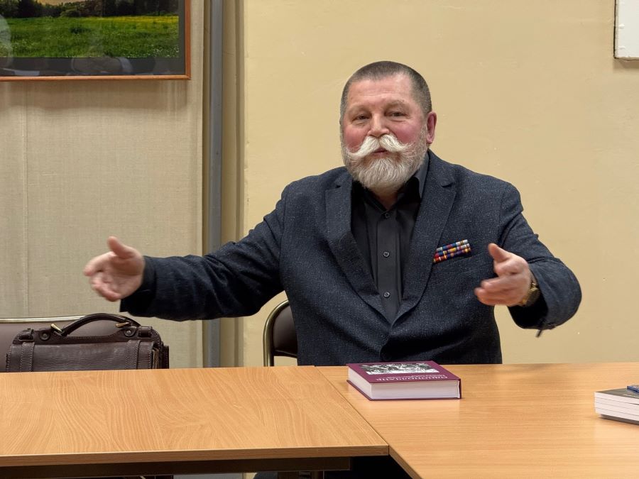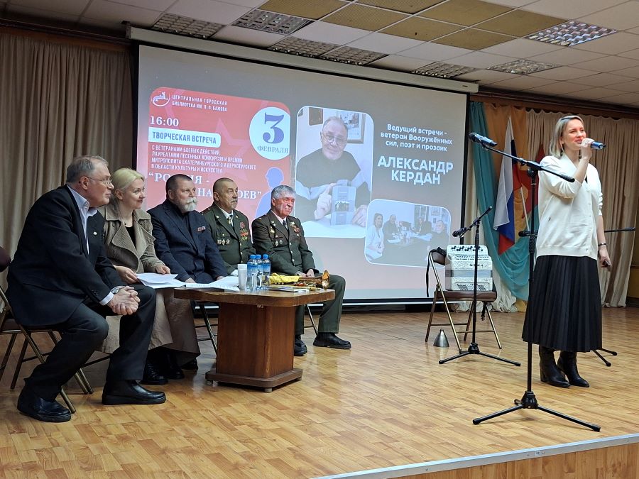 С ним приехали: Анатолий (Арсен) Борисович ТИТОВ — председатель Екатеринбургского отделения Союза российских писателей, прозаик и переводчик, лауреат международных и всероссийских литературных премий, член Общественного совета при министерстве культуры Свердловской области; Юрий Алексеевич КУКСИН, член Союза российских писателей, полковник в отставке, ветеран боевых действий. Руководитель коллектива «Офицерское трио», лауреат всероссийских конкурсов военно-патриотической песни, премии МВД РФ и всероссийской литературной премии имени поэта-фронтовика В.Т. Станцева; Александр Васильевич ШЕСТАКОВ, ветеран боевых действий, участник ансамбля «Офицерское трио»; Наталья Андреевна ШЕСТАКОВА, заместитель директора СОУНБ имени В.Г. Белинского по научной и методической деятельности; Наталья Васильевна ДЕНИСЕНКО, поэтесса, член Союза писателей России.