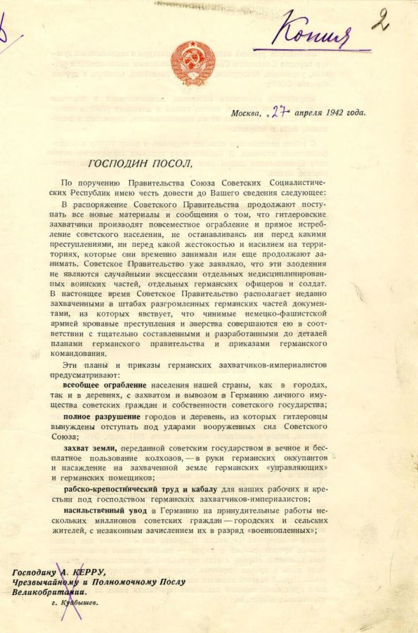 Публикацией свидетельств о нацистских преступлениях руководил нарком иностранных дел Вячеслав Михайлович Молотов. Публикации были ориентированы и на советского, и на западного читателя. В том числе нарком подчёркивал презрение нацистов к международному праву. 27 апреля 1942 года вышла «Третья нота о немецких зверствах» (оцифрованный документ в фонде Президентской библиотеки). В ней Молотов ссылался на документы, которые были захвачены у врага. В них говорилось, что военные преступления — часть единого плана. В ноте он писал, что лидеры нацисткой Германии и их приспешники не избегнут наказания.