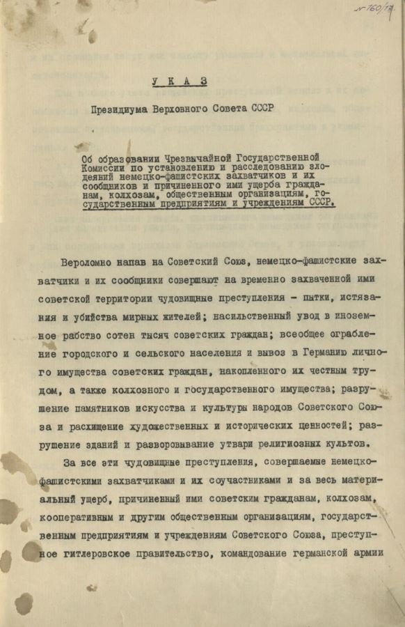2 ноября 1942 года в СССР была учреждена Чрезвычайная государственная комиссия по установлению и расследованию злодеяний немецко-фашистских захватчиков в СССР (оцифрованный документ в фонде Президентской библиотеки). В её состав вошли государственные служащие и деятели культуры, в том числе Алексей Толстой и Илья Эренбург.